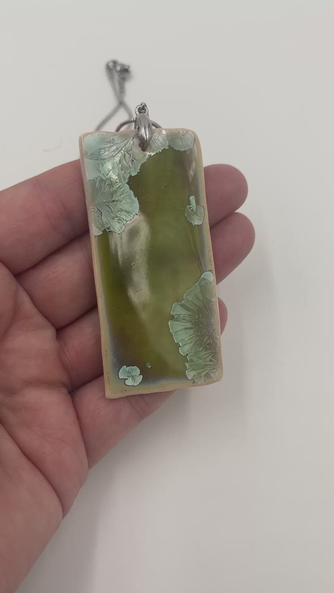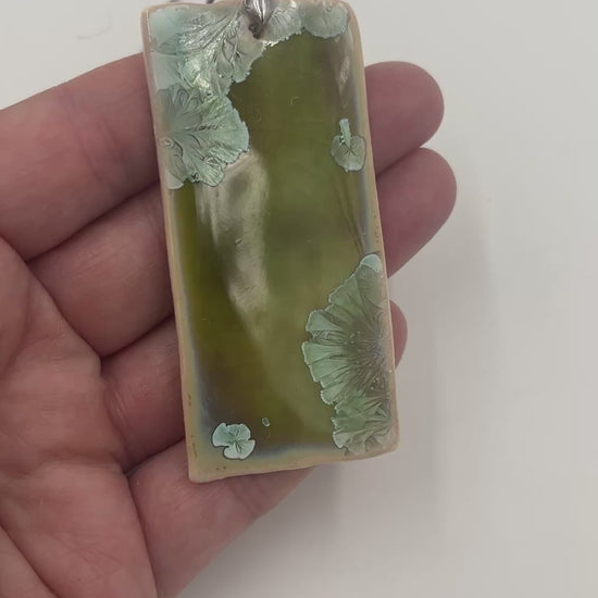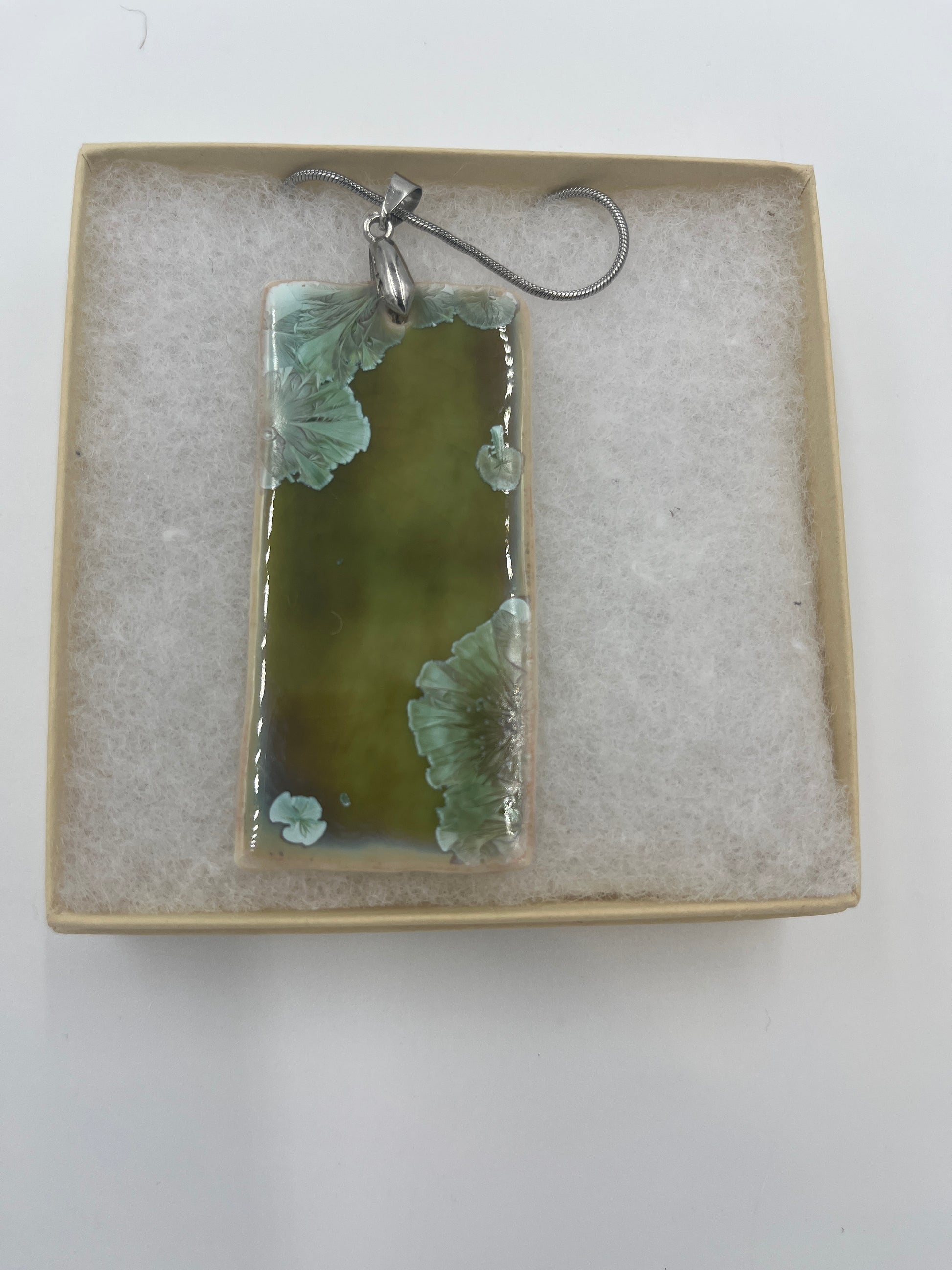 Rectangular porcelain necklace approx 1.25” x 2.75” with a beautiful green crystalline glaze.