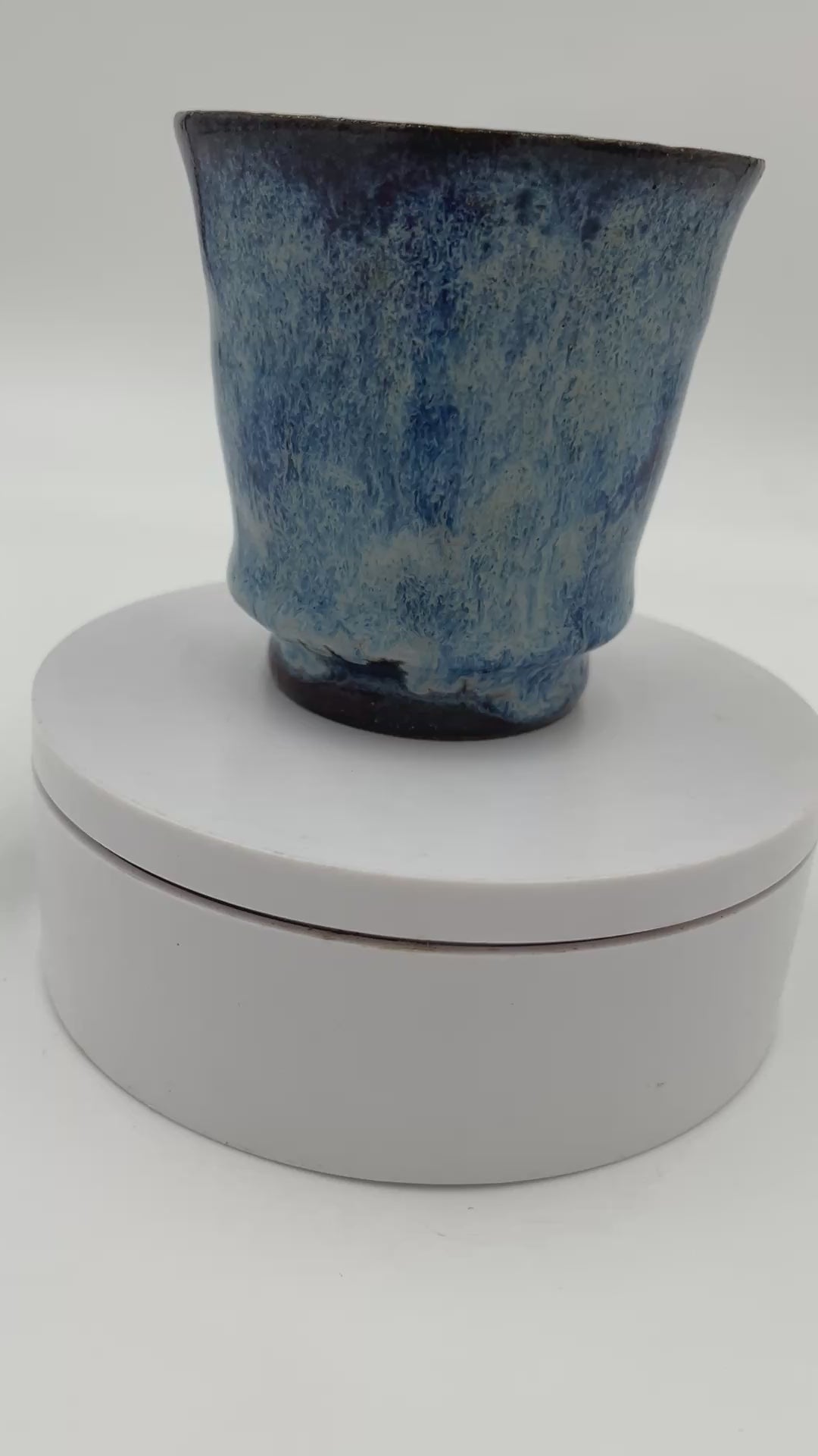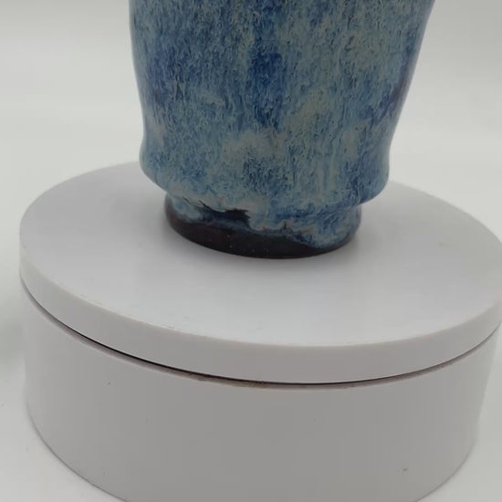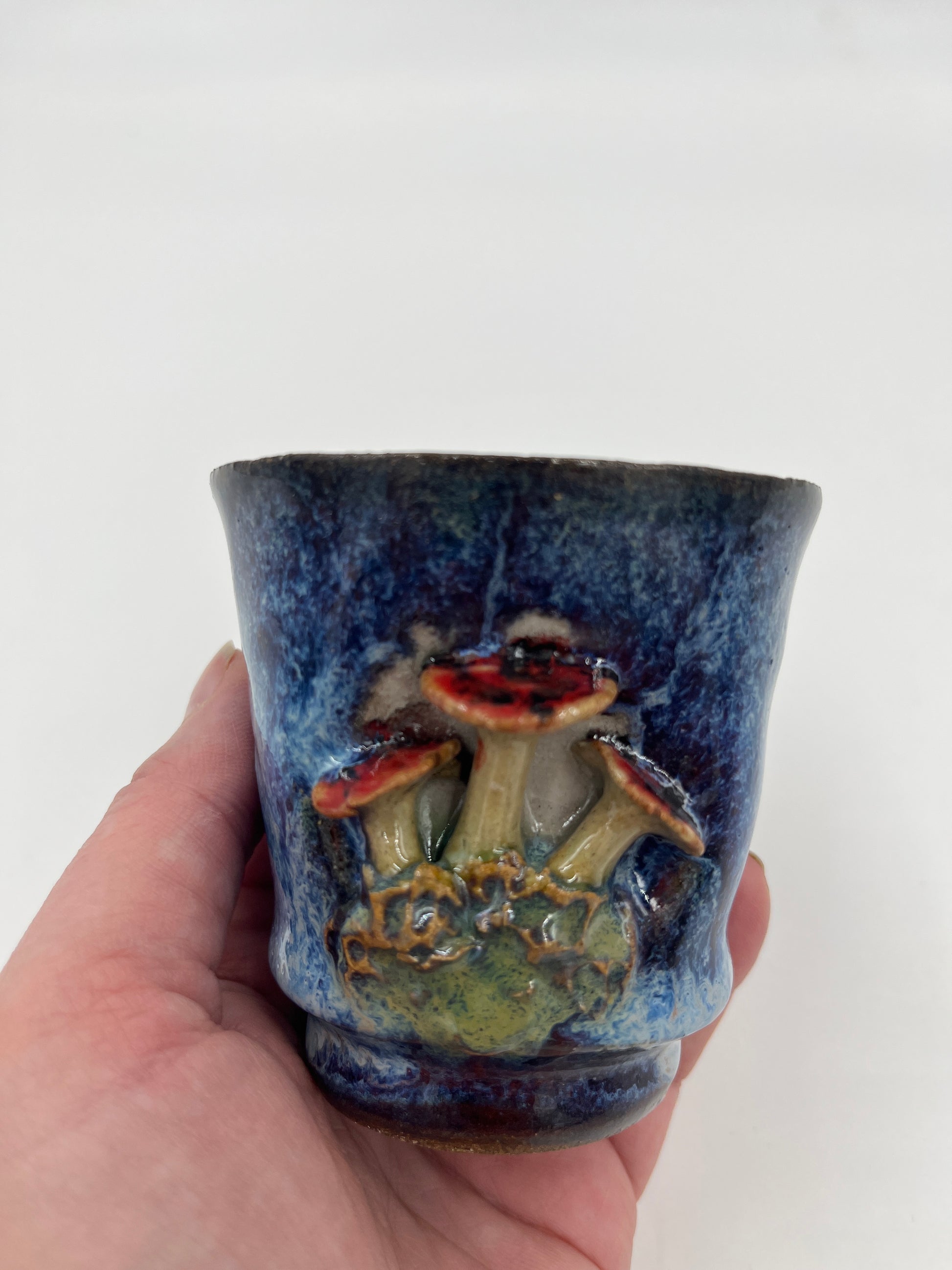 This beautiful mini mushroom mug is thrown on the pottery wheel and altered. It is indented with 3D mushrooms on the front. Utilizes a Red / Blue glaze on the front.