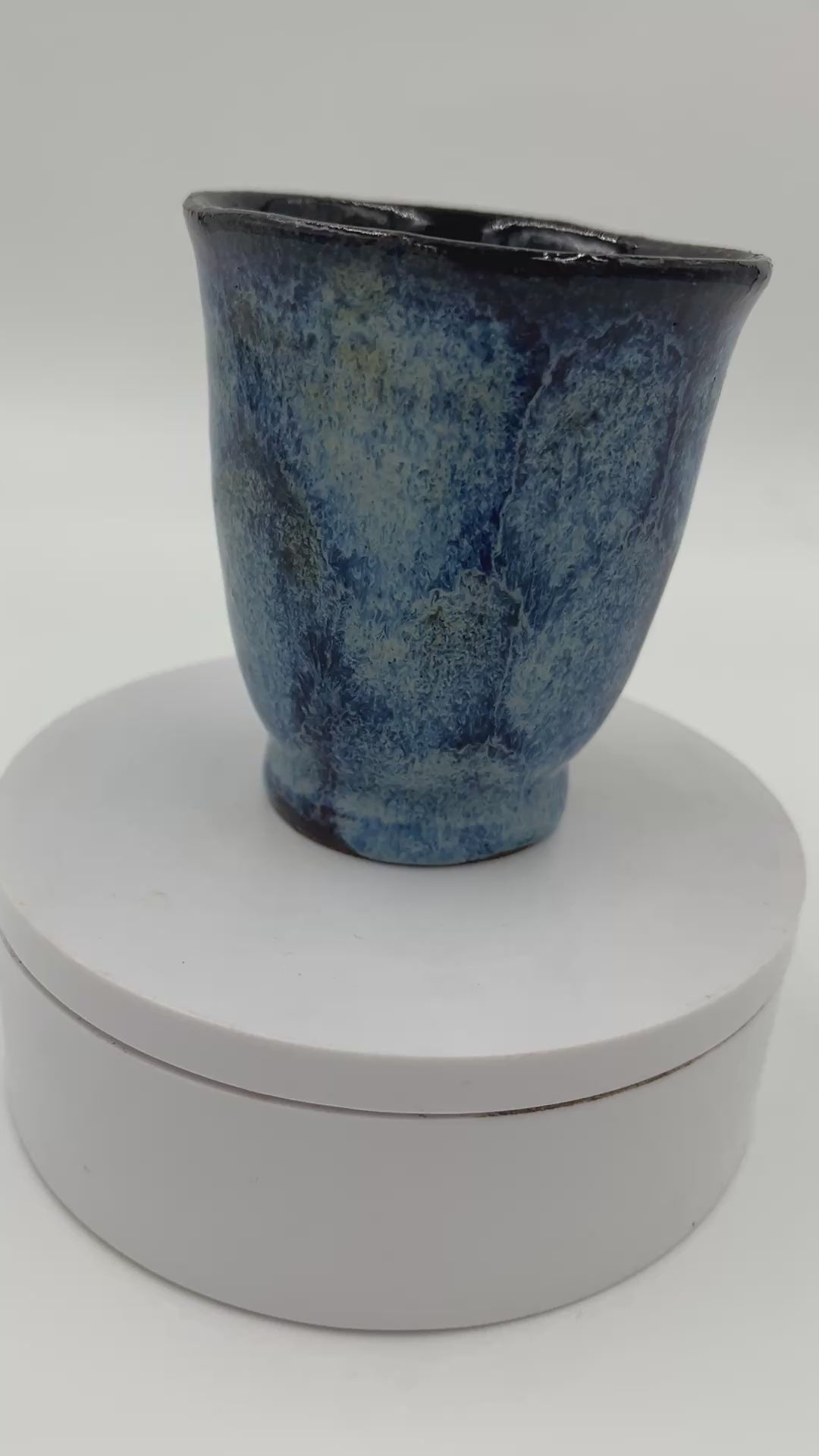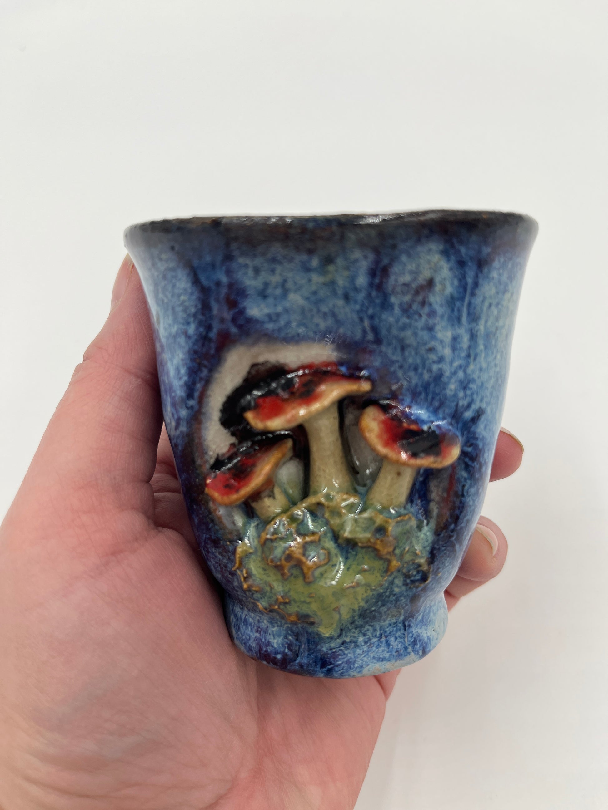 This beautiful mini mushroom mug is thrown on the pottery wheel and altered. It is indented with 3D mushrooms on the front. Utilizes a Red / Blue glaze on the front.