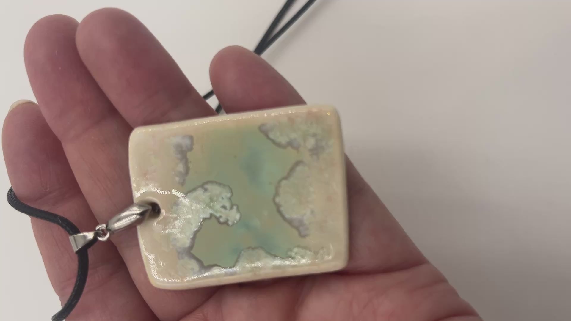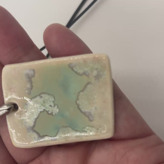 Porcelain necklace approx 1-3/8” x 1-3/4” with a beautiful green crystalline glaze.