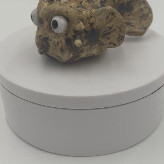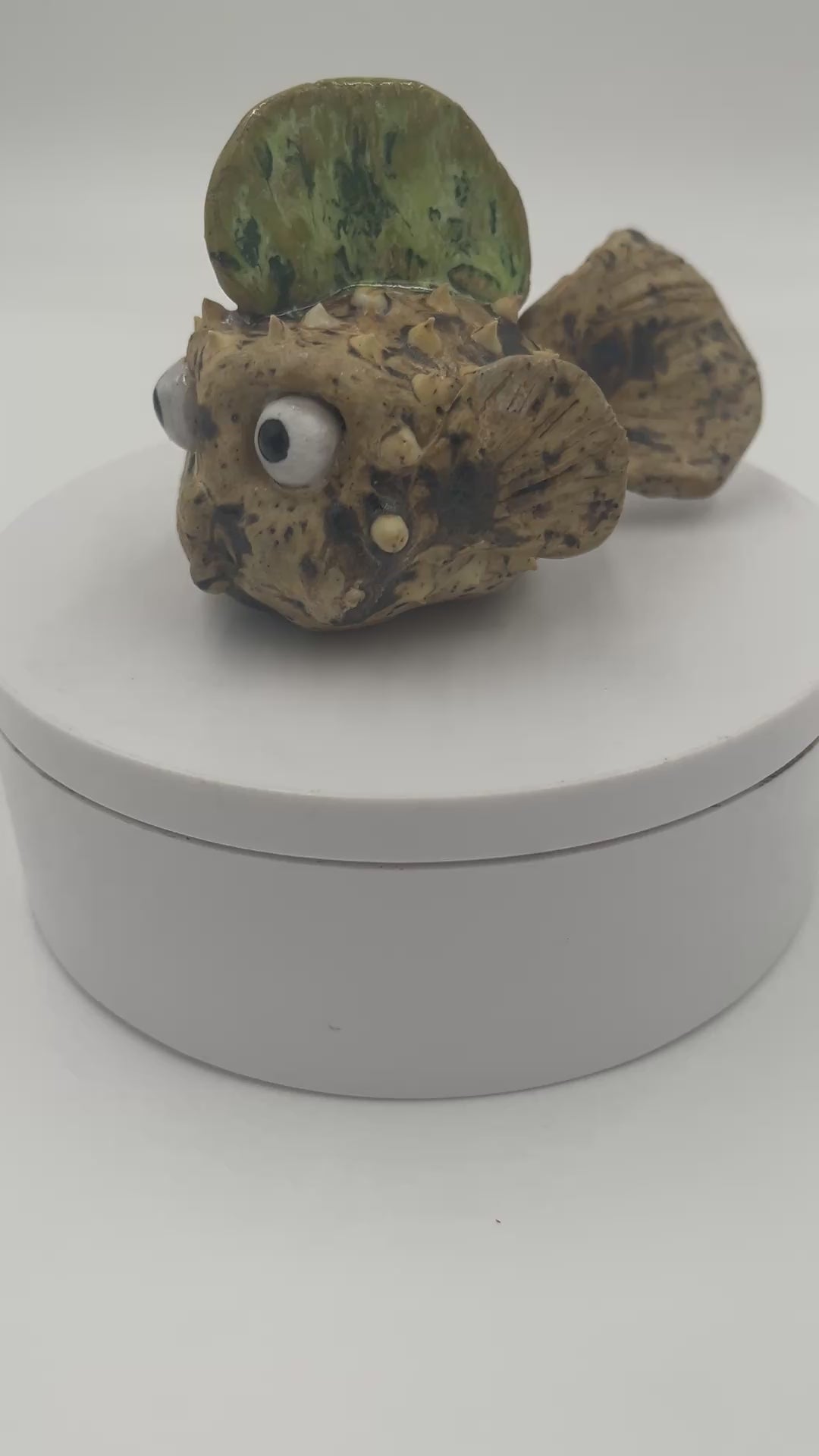 Adorable hand built punk rock puffer fish with a green speckled Mohawk.
