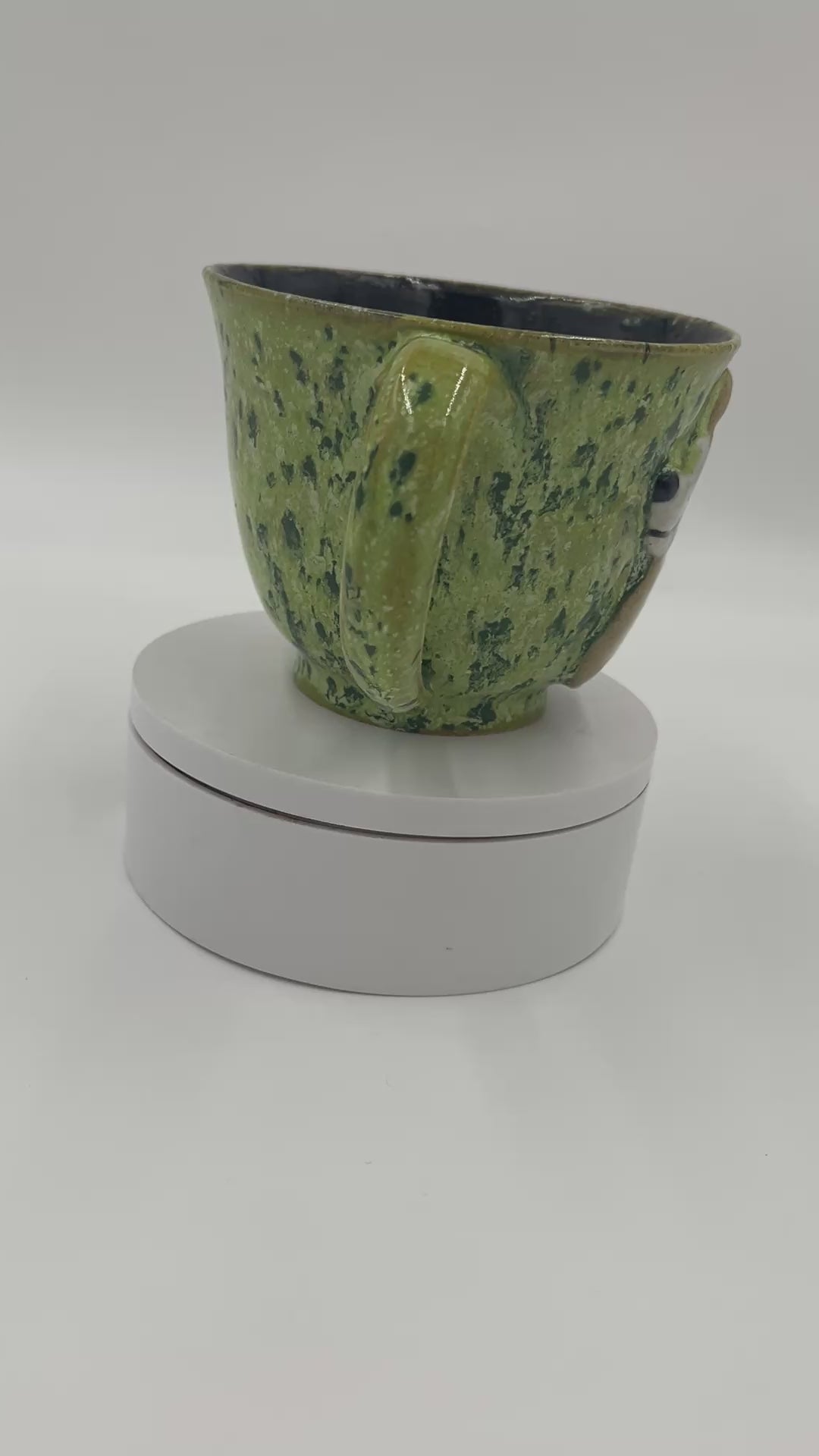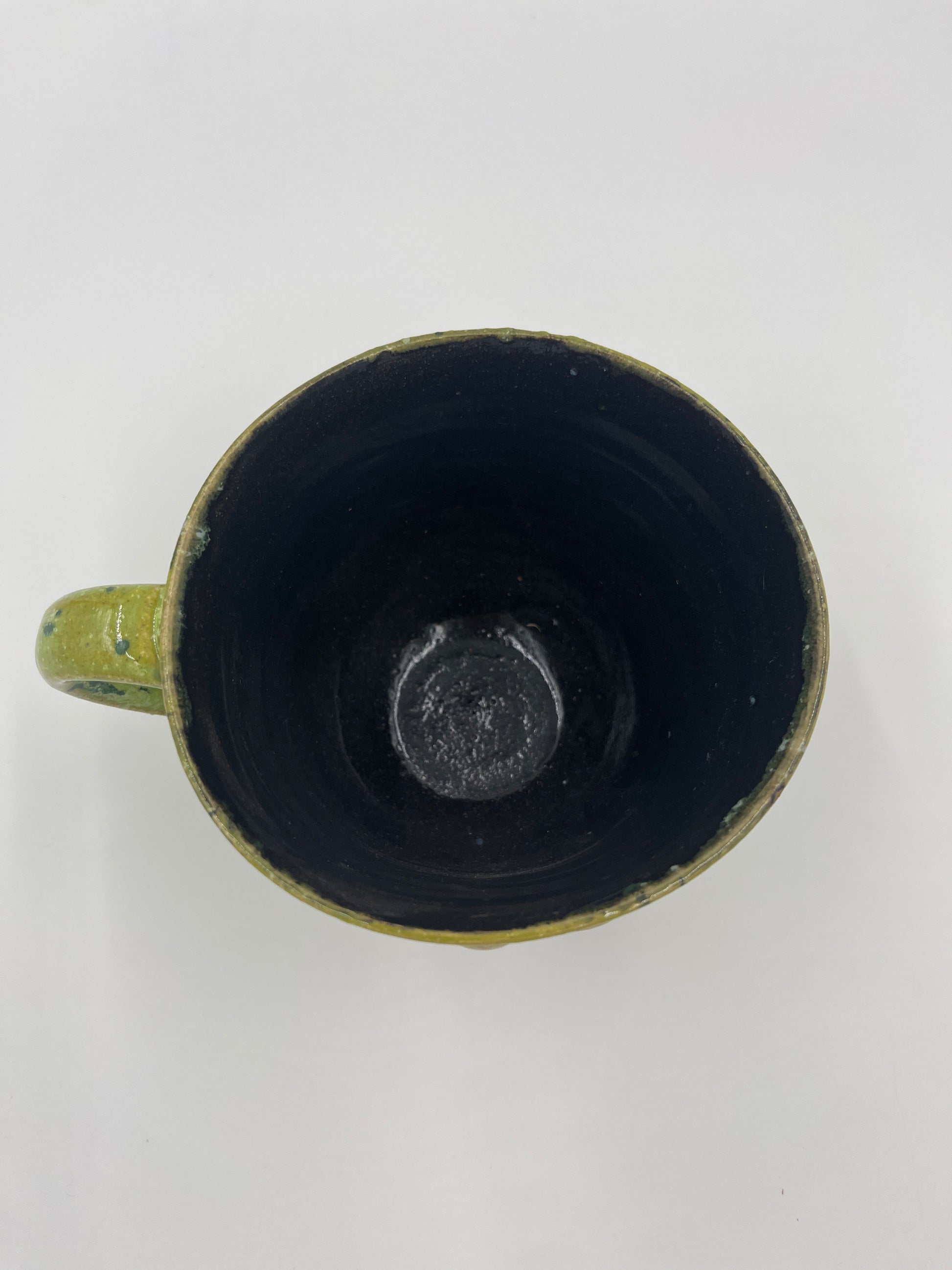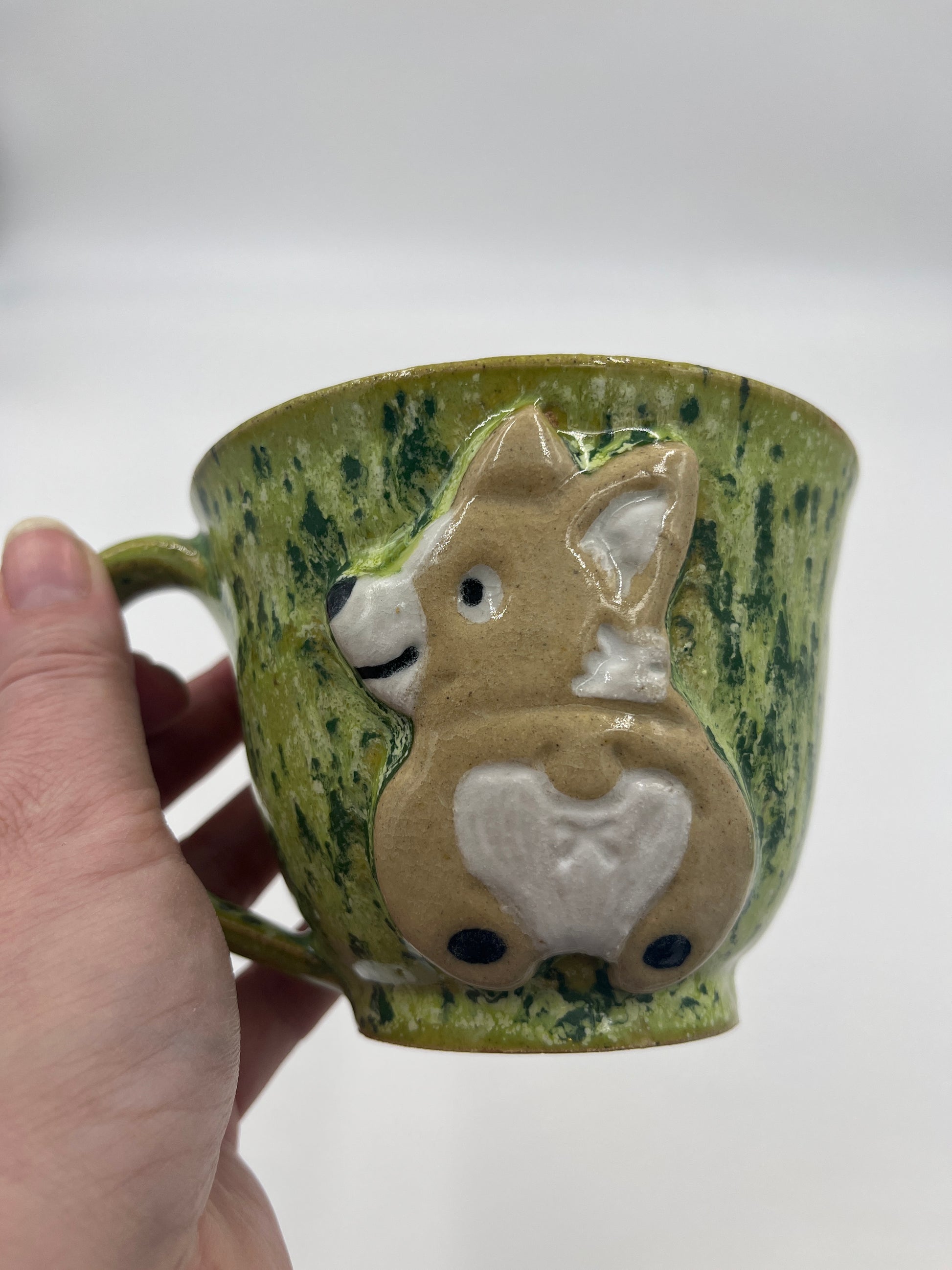 Beautiful wheel thrown mug with an adorable hand painted Corgi. This mug utilizes a bright green speckled glaze on the outside.