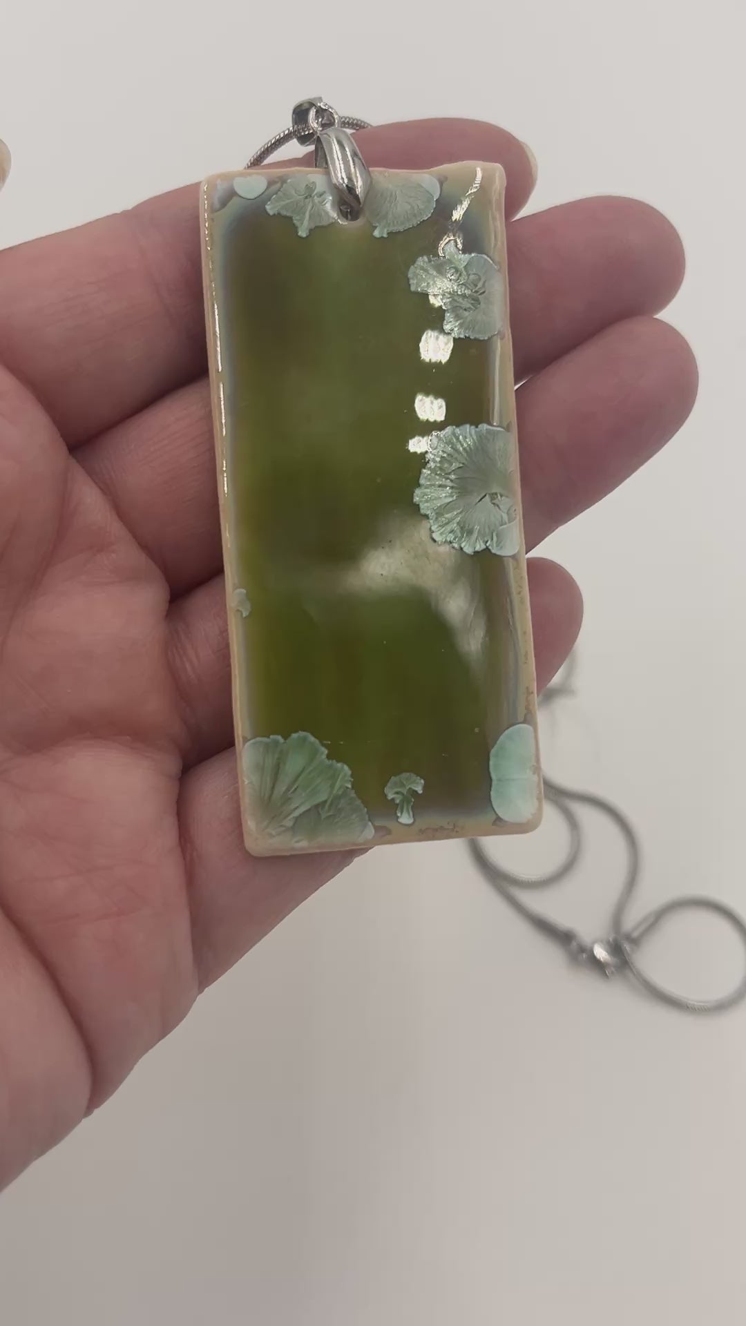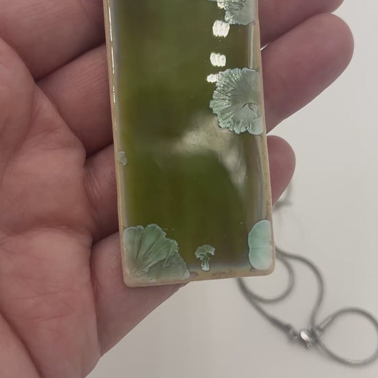 Rectangular porcelain necklace approx 1.25” x 2.75” with a beautiful green crystalline glaze.