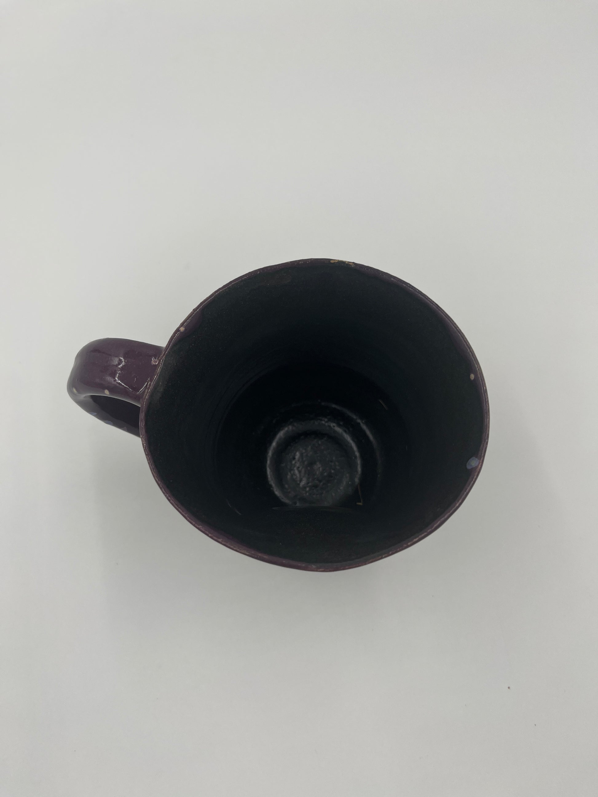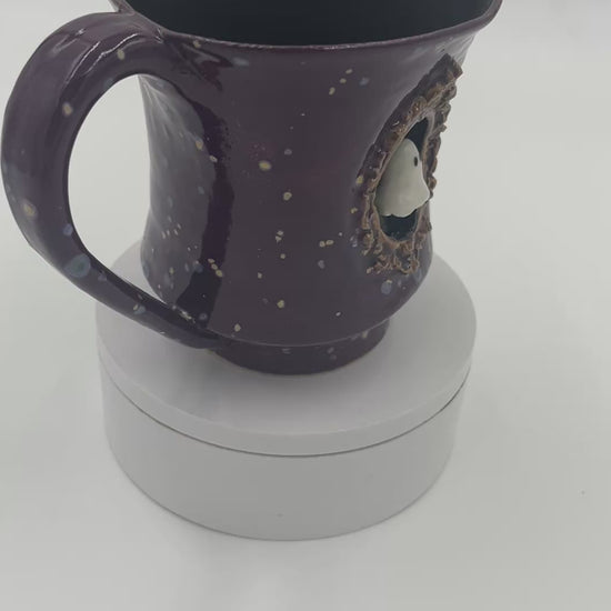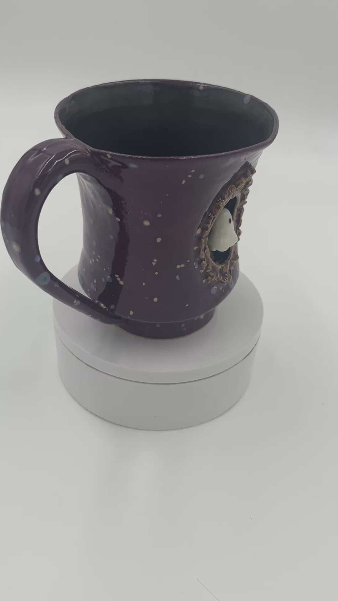 Beautiful wheel thrown and altered mug. Indented with a mirror frame and an adorable little ghost. This mug utilizes a purple glaze on the outside
